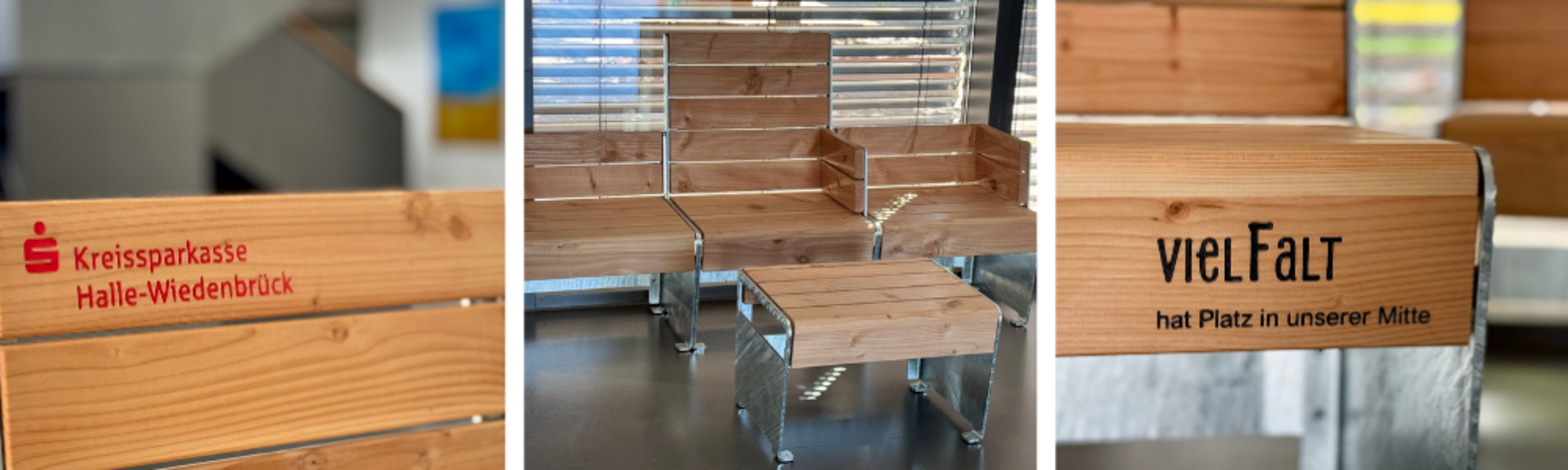 Die Vielfalts-Bank made by wertkreis Gütersloh wird aus Europäischer Lärche für Ihr Unternehmen angefertigt und mit Fräsungen ihres Unternehmenslogos, dem Logo der Wirtschaftsinitiative Kreis Gütersloh e.V. und dem Motto "Vielfalt hat Platz in unserer Mitte" auf jedem Modul versehen. Das elegant-schlichte Design aus Holz und Edelstahl und die modullare Bauweise der Bank, lassen Sie problemlos auch bei Ihnen im Unternehmen ein "Zuhause" finden.